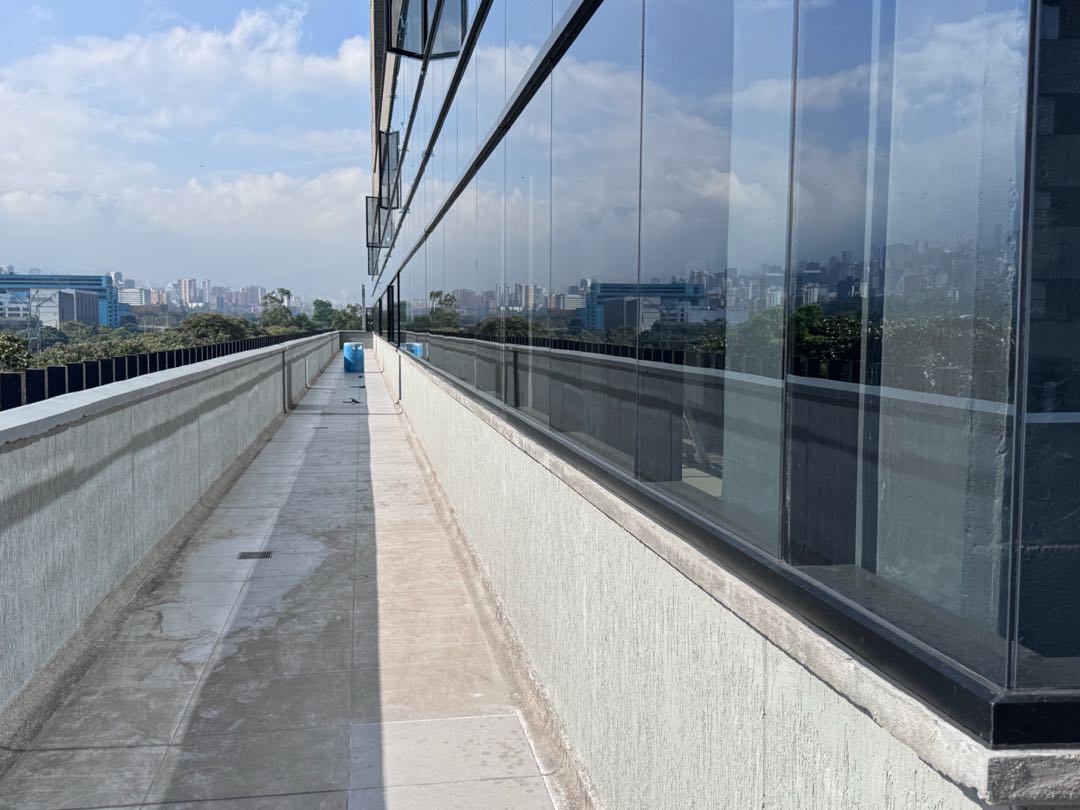 VENTANERÍA: Ventanería fija sellada con pisavidrios y un módulo batiente en uno de los extremos. Perfiles en aluminio color negro y vidrio claro, a excepción de pisos 6 y 7 en la que el vidrio contará con capa metálica.